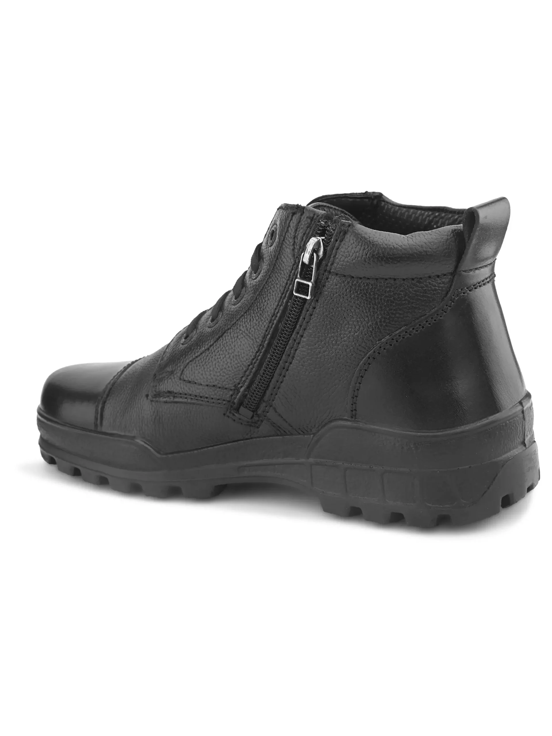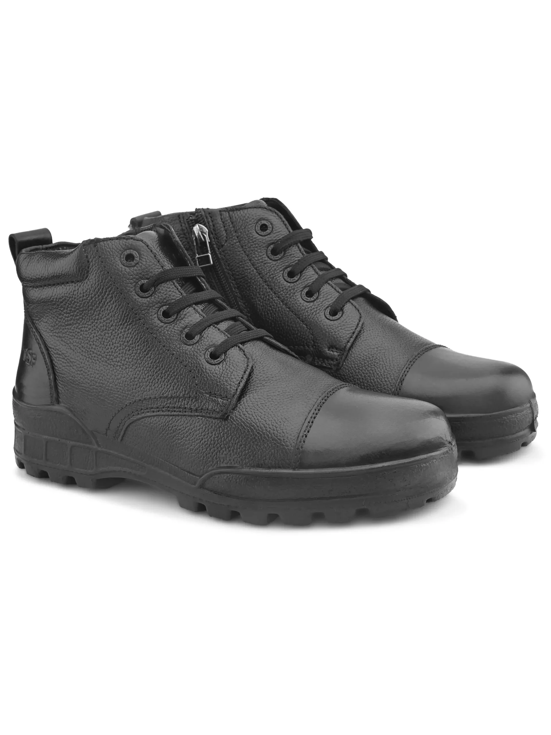 Step into confidence with these premium black lace-up ankle boots, engineered for strength, comfort, and a professional appearance. Made from high-quality textured leather, these boots are built to withstand daily wear while maintaining a clean, polished look. The ankle-high construction offers added stability and support, ideal for demanding work environments.