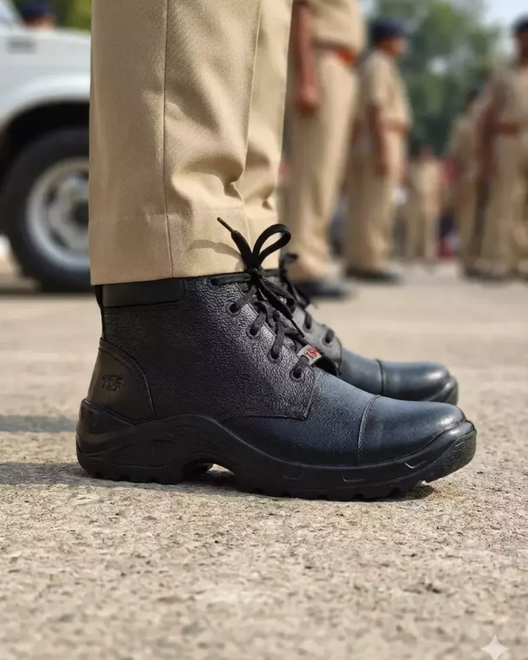 The ankle-height design ensures proper support and stability, helping reduce foot fatigue during long hours of standing and walking. A secure lace-up closure allows an adjustable and snug fit, while the lightweight yet durable sole offers reliable grip on roads and indoor surfaces. Soft inner cushioning and a padded collar enhance comfort throughout extended duty shifts.