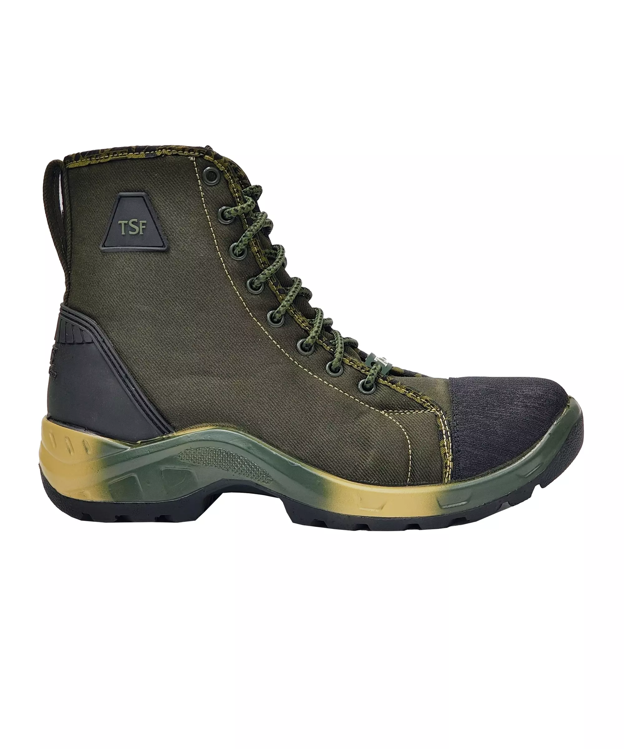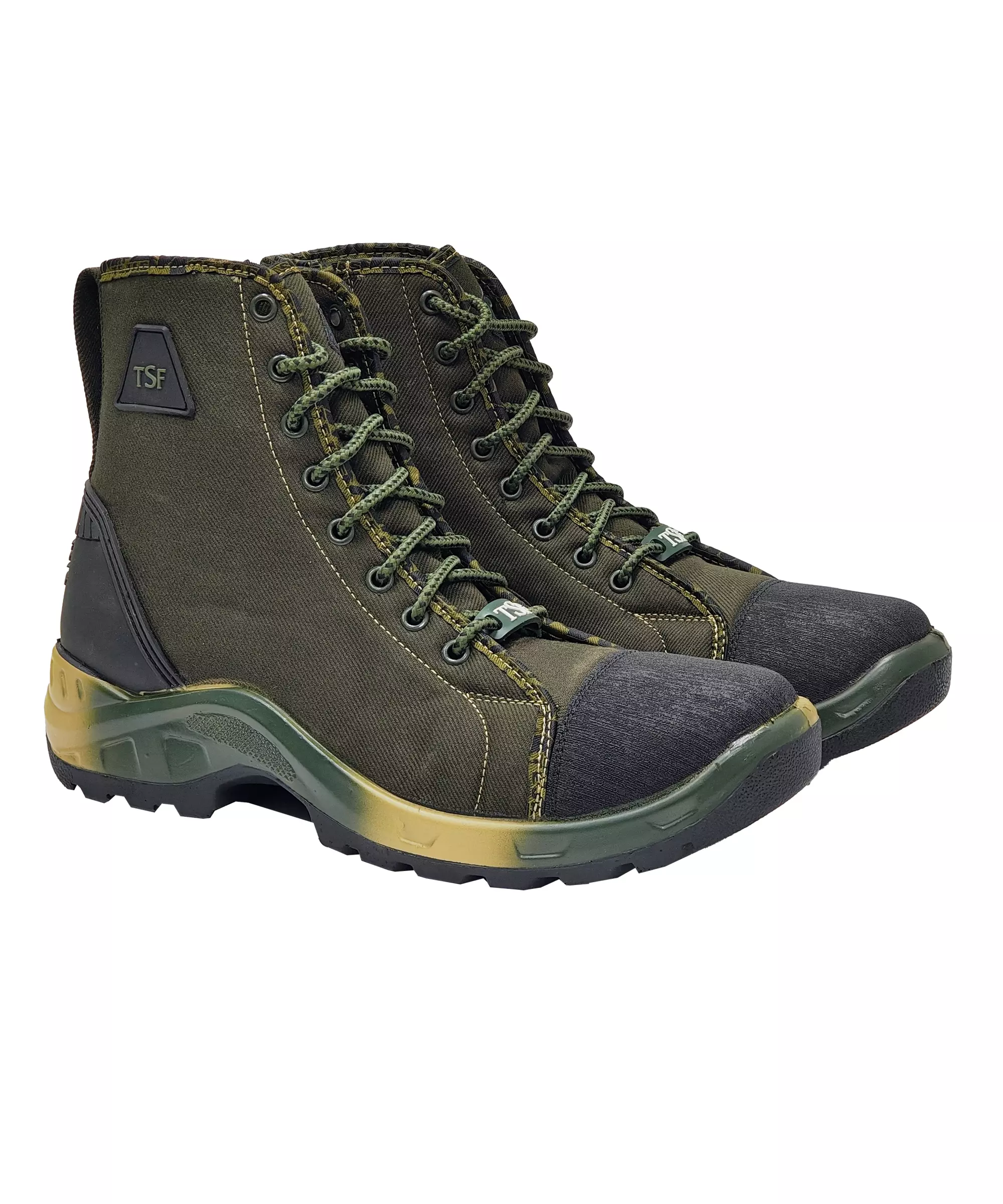 Designed for durability and refined presentation, this premium high-top boot is showcased in a luxury studio photoshoot setting that emphasizes craftsmanship and material quality. The shoe features a rugged yet sophisticated olive-green upper, combining high-grade fabric with reinforced leather panels for enhanced protection and long-term wear.